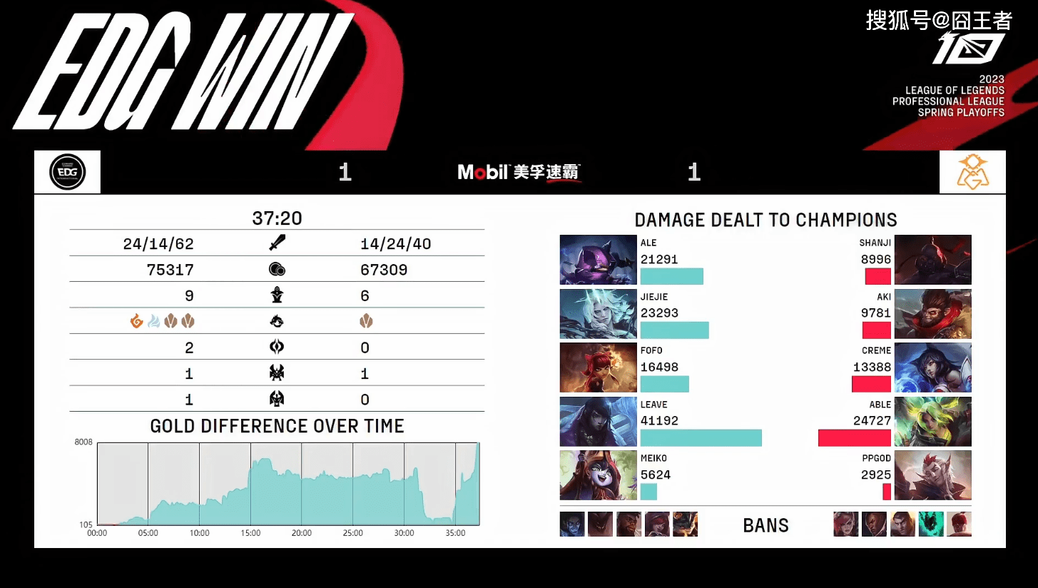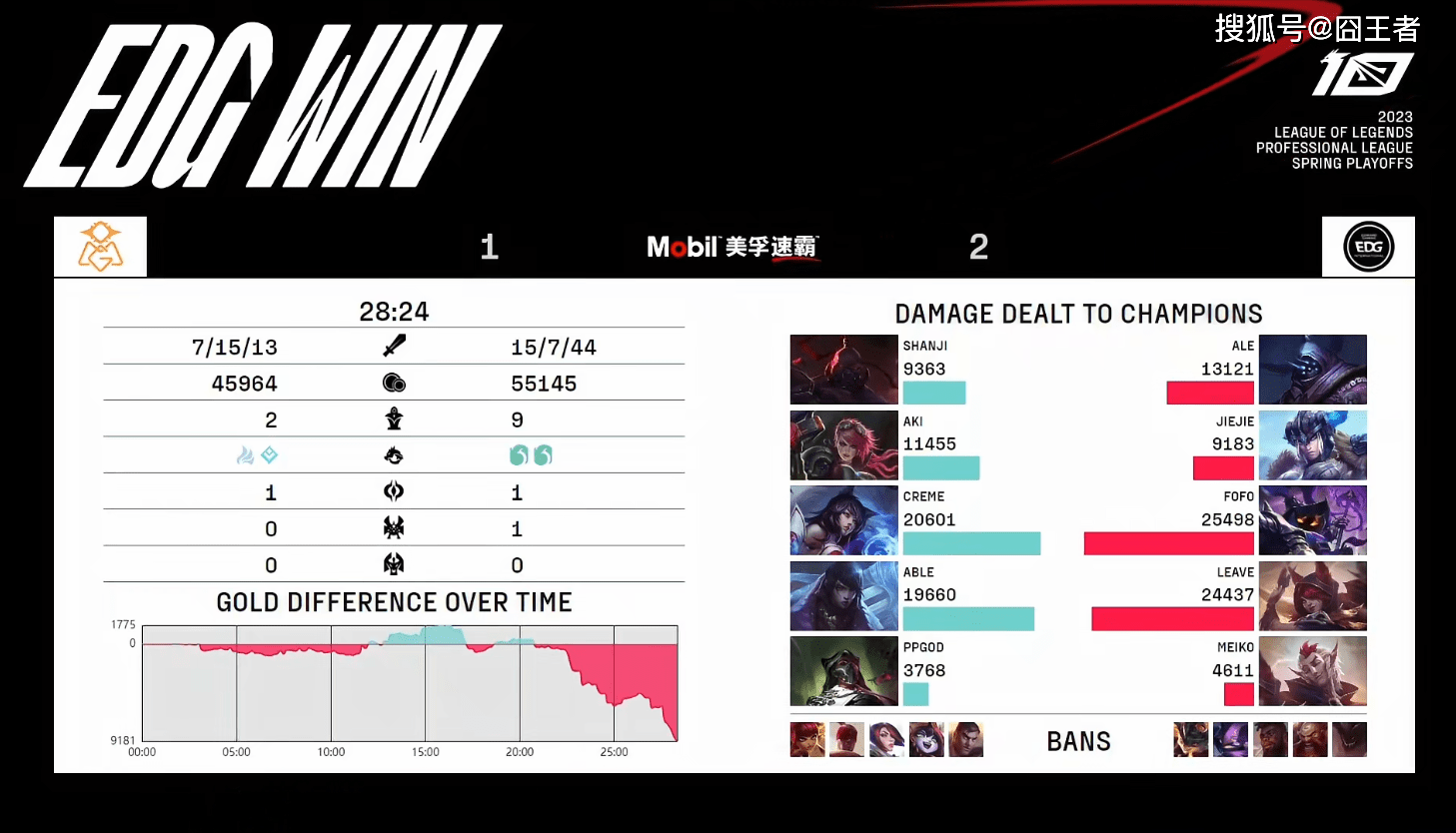 两队第一局的比赛,打得跌宕起伏,且各打了半场好局。EDG在比赛的前30分钟里面,通过打架,一度打出了近6000的经济优势。但是OMG在失去经济的时候,却通过控龙战术,拿到了三条小龙。正当绝大多数玩家认为EDG会滚雪球获胜时,EDG却又犯“领先后不会打比赛”的病。这次虽然没有领先一万,但依旧被OMG在30分45秒时,抢到水龙魂打出了转折点,吹响了反攻的号角。最终37分41秒,OMG再次打出1换4后,逆天翻盘,先赢一局!