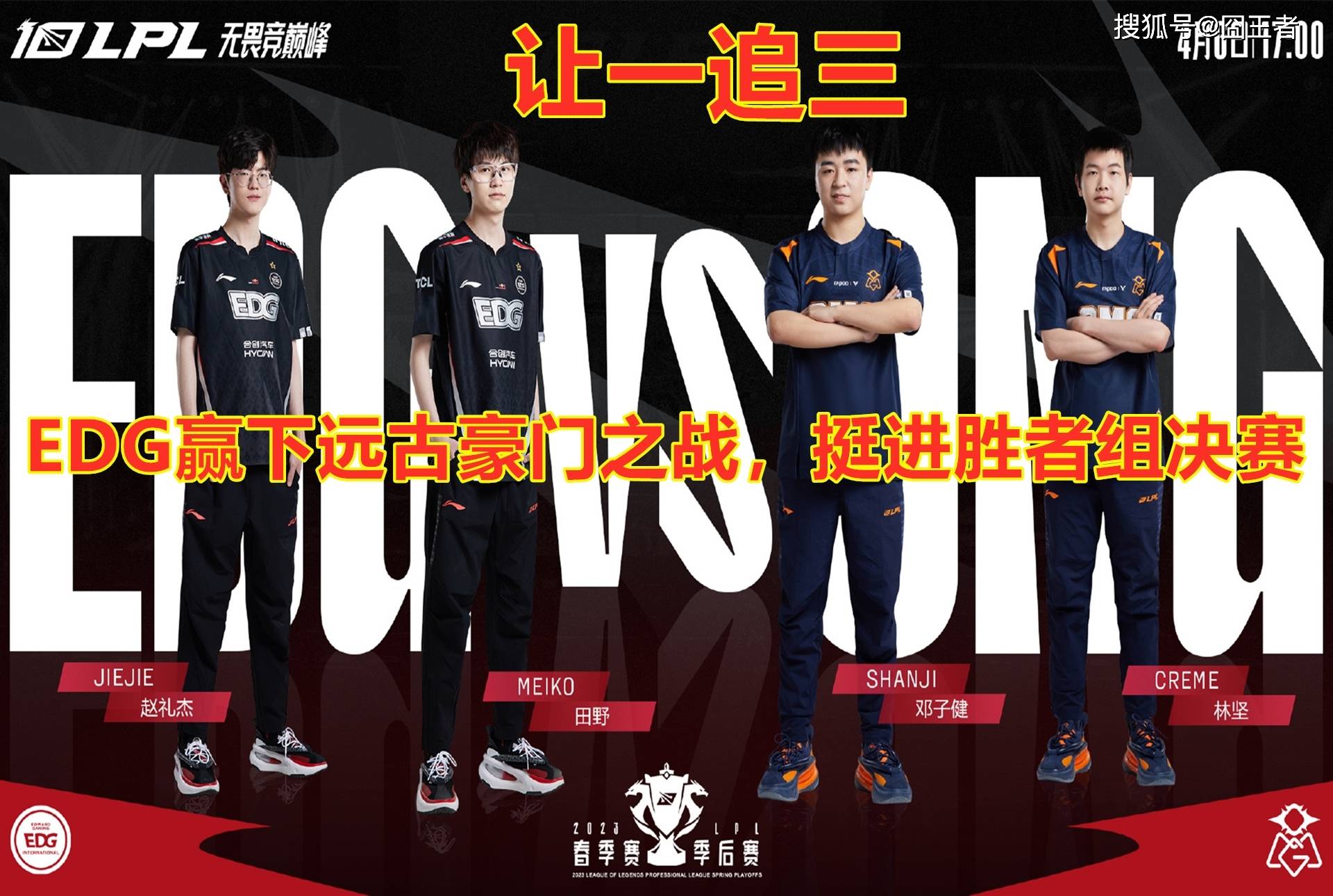 进入第四局后,背水一战的OMG放手一搏。EDG在前10分钟于上下路,均打出对线优势,领先近1000的优势。但是在10分钟以后,OMG在先锋团战中大获全胜,瞬间抹平了前期的劣势,并在后续的比赛中一路打出了3000多的经济优势并保持在比赛的中后期。只不过可惜的是,相较于多年一直“摆烂”的OMG,EDG拥有更多的大赛经验,他们在劣势的情况下韧性十足,一直将比赛拖到了30分钟以后的后期,并且等来了转折点——在远古龙团战中,阿乐赛恩开车,撞碎了OMG的下路组合后,EDG团战大胜,并且一波赢下比赛,挺进胜者组决赛。