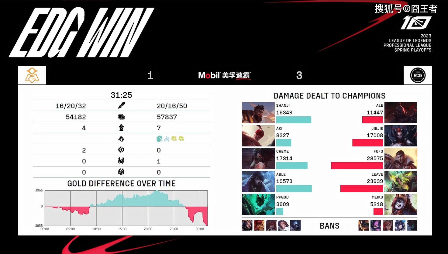 EDG在赢下OMG之后,不仅将OMG打入败者组,还直接和JDG在胜者组决胜中会师。在这里除了恭喜EDG和JDG之外,囧王者还想说的是,OMG尽管输了比赛,但他们在这个赛季的表现,当真可圈可点。特别是山鸡和小奶油这两名选手,如果他们能保持这个赛季的状态的话,未来绝对可期!走A怪,强势了几局,但第四局被塞恩直接撞碎,可惜了!