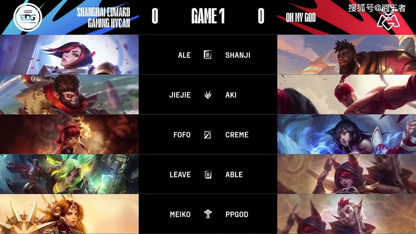 第一局比赛,EDG蓝色方,禁用兰博、凯南、厄斐琉斯、瑟庄妮、茂凯,选用剑姬、孙悟空、安妮、泽丽、蕾欧娜;OMG红色方,禁用楚雨荨、杰斯、璐璐、纳尔、赛恩,选用奎桑提、盲僧、阿狸、霞、洛。