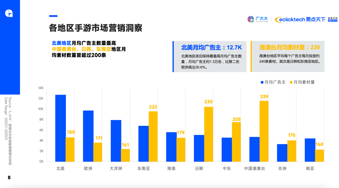 其中北美地区月均广告主数量约1.3万名排名第一,月均素材量则是中国港澳台、日韩、东南亚最高,月均素材数量皆突破200条。
