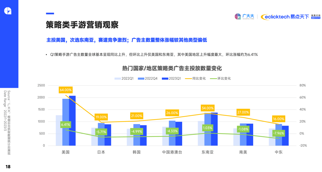 无论是广告主占比还是投放素材占比,策略类产品都呈现出了同比下降趋势。在热门出海市场中,除美国、东南亚地区广告主数量出现环比提升外,像日韩、中东、港澳台地区的策略广告主都下降明显。其中,中东2023年Q1策略广告主环比下降约8%。
