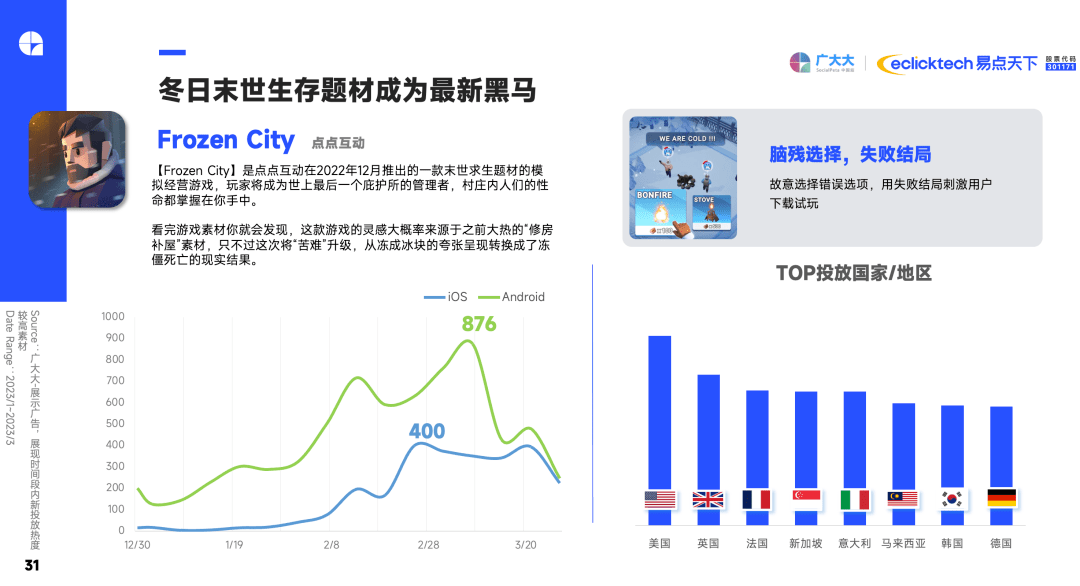 点点互动旗下模拟经营新游【Frozen City】,凭借冬日末日生存题材一跃成为2023出海新游中最闪亮的明珠。