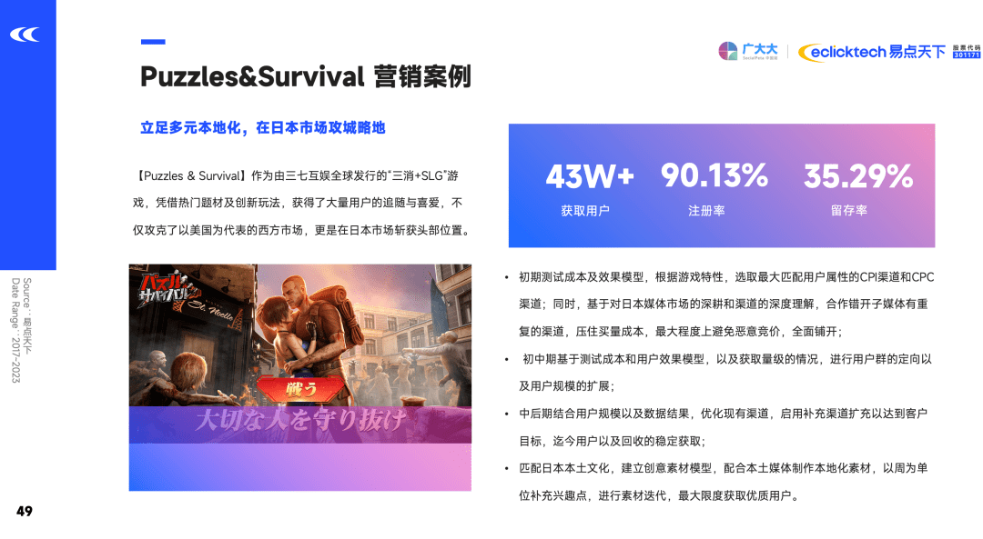 对此,与本土IP联动就成了常见又有效的本地化措施,例如三七互娱旗下【Puzzles & Survival】就充分利用了本身的末日丧尸生存题材,成功联动《生化危机》。除了在买量素材、买量渠道上根据日本玩家喜好进行调整、制作本地化素材 。
