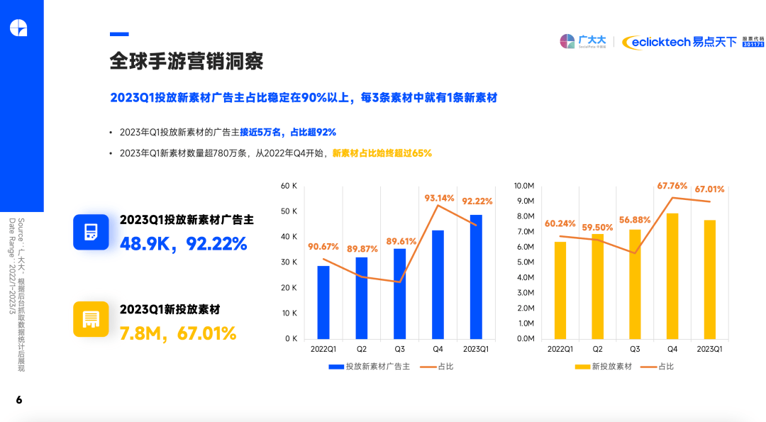 2023年将是游戏市场复苏之年,也是经受后疫情时代考验的1年,作为一年伊始, 2023年Q1新投放广告主数量接近5万名,新投放素材数量接近800万,其中每3条投放素材中就有1条新制作。