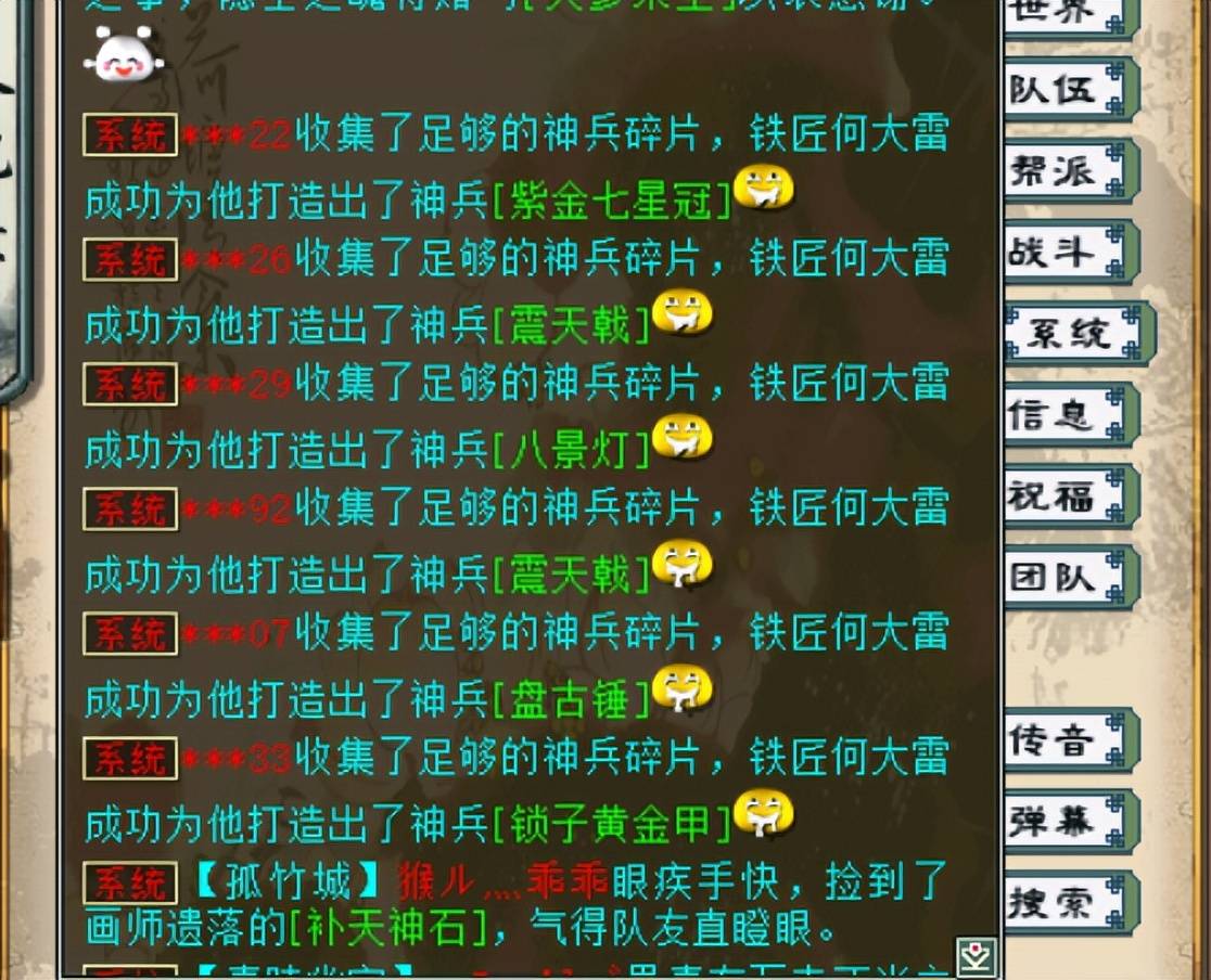 同一时段内,一口气连出了六件神兵,而且这六件神兵,都是用神兵碎片找何大雷换到的,那么看到这儿,大家想到了什么呢?或许这六件神兵,是出自同一人之手,一件紫金七星冠开头,一件锁子黄金甲结尾,乍一看这一幕有些大事不妙吖,这都是垫子。不过也先别急着下结论,那不还有4件武器嘛,这震天戟或许是件双回也说不好。那么真的如此吗?咱们一起来看看。