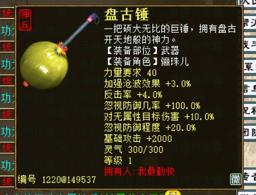 再来看最后一件武器,这件盘古锤可以说是算得上“全村人民的希望”,然而这件武器果然没辜负大家的期待,这是一件沧波双破物理的锤子,这样一件武器,市场上少数也要值两个垫子,所以件锤子还是不亏钱的,如果换成是加强霹雳效果的话,那就更加完美了。不过整体来看,六件神兵还是有点翻车,大家怎么看呢?欢迎评论区留言讨论哦。更多精彩,咱们下期再见吧。