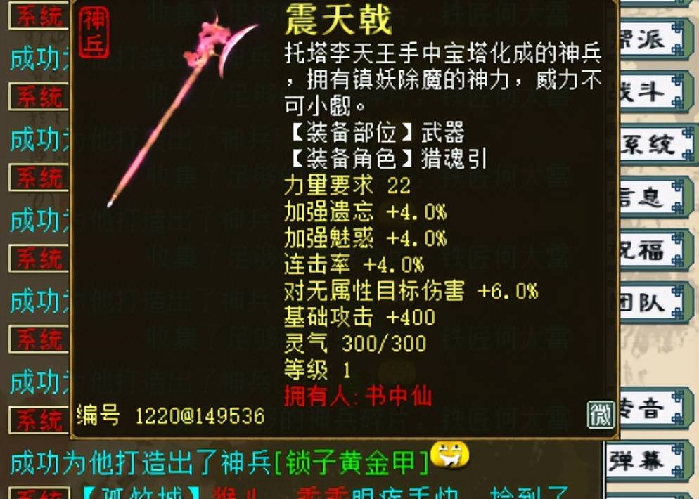 再来看另一件震天戟,加强魅惑的属性是有了,可是另一项加强遗忘的属性,但凡换成加强三尸虫、加强三尸虫回血程度,这件武器宣告覆灭。