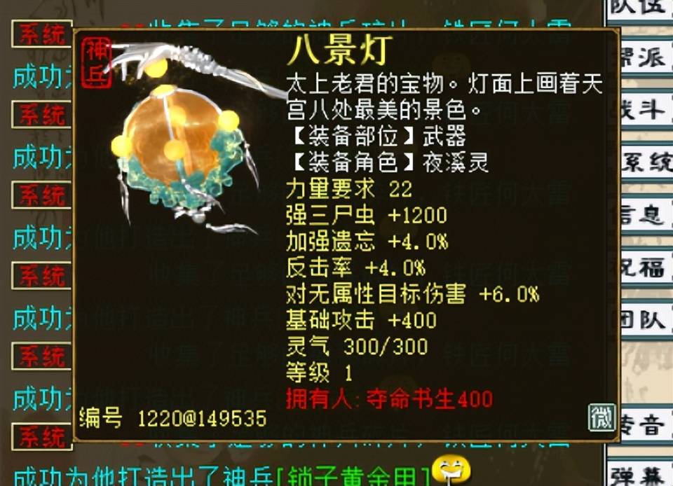 再来看这件八景灯,却是是男鬼强三尸虫的属性,可惜不是双回,更可惜的是,这是一件女鬼的武器,所以,强三尸虫到底有啥用呢?