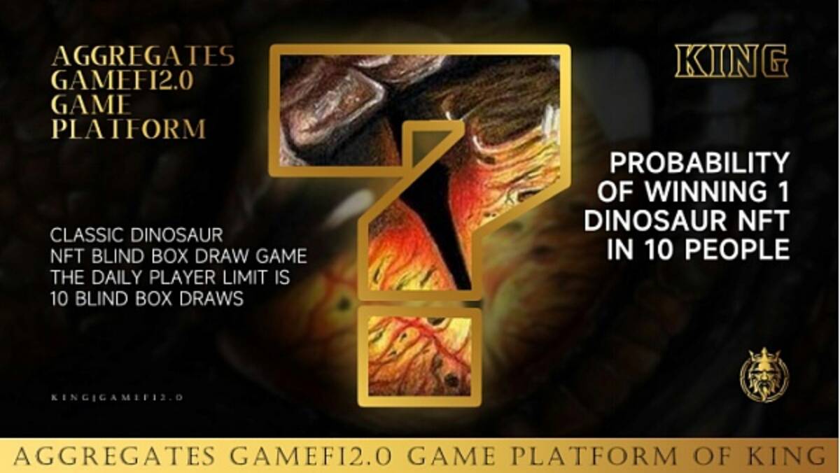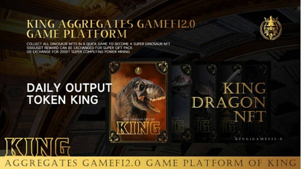 基于BSC币安智能链开发,KING链游聚合平台总发行2100万枚King通证。玩家首先需购买入场券,不同入场券对应不同收益额的上限。使用入场券开启恐龙NFT盲盒,开中恐龙盲盒即可获得一张恐龙NFT,集齐10个恐龙NFT可兑换一张超级恐龙NFT;开不中恐龙盲盒,退回拆盲盒使用的门票本金,并且获得本金1%的奖赏。超级恐龙NFT可直接兑换超级礼包(1000USDT)或者兑换2000T超级算力挖矿。