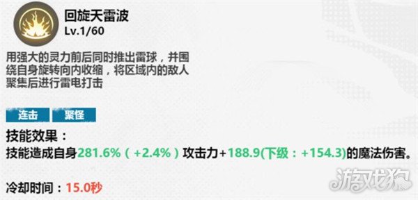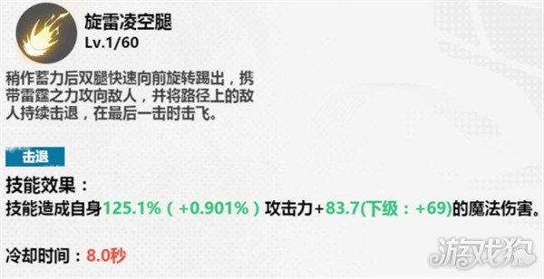 与旋雷凌空腿有着异曲同工之妙,具备击退作用,不过雷动波的威力更强些,魔法伤害直接+318.7。同时,气斗作战更为灵活,如蓄力释放,蓄力时间越久,对敌人的伤害越高,冷却时间为25秒。