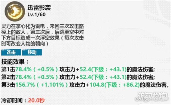 此技能拥有连击和移动的效果,同时在对敌人进行攻击时可运用雷电来回三次攻击,第三次攻击伤害达到最高峰值。