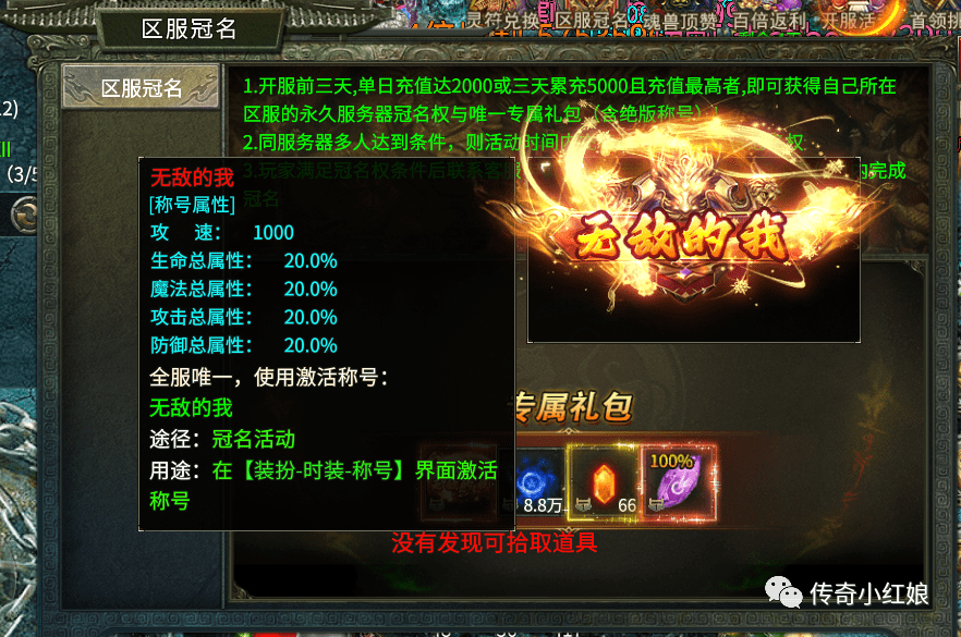 我们先来看看冠名活动的奖励,以及这款绝版称号的加成属性。称号“无敌的我”全服唯一,切只有开服冠名活动能获得,属性加1000的攻速,另外加百分之20的生命,魔法,攻击和防御,相当给力的一个称号。(包服玩家可直接活动,包服2000米)