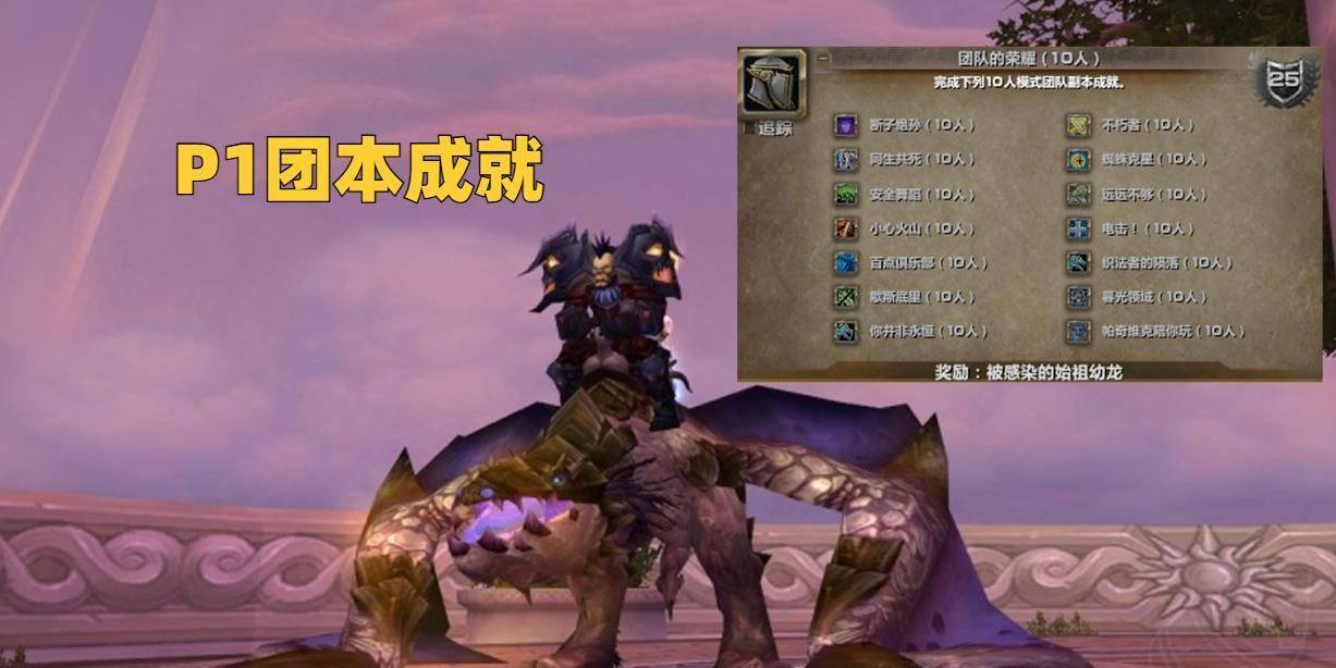 所谓的P1阶段团本成就,其实就是10人模式团队的荣耀和25人模式团队的荣耀,这两个成就都会奖励始祖幼龙坐骑,并且这两个坐骑也都是310%速度。