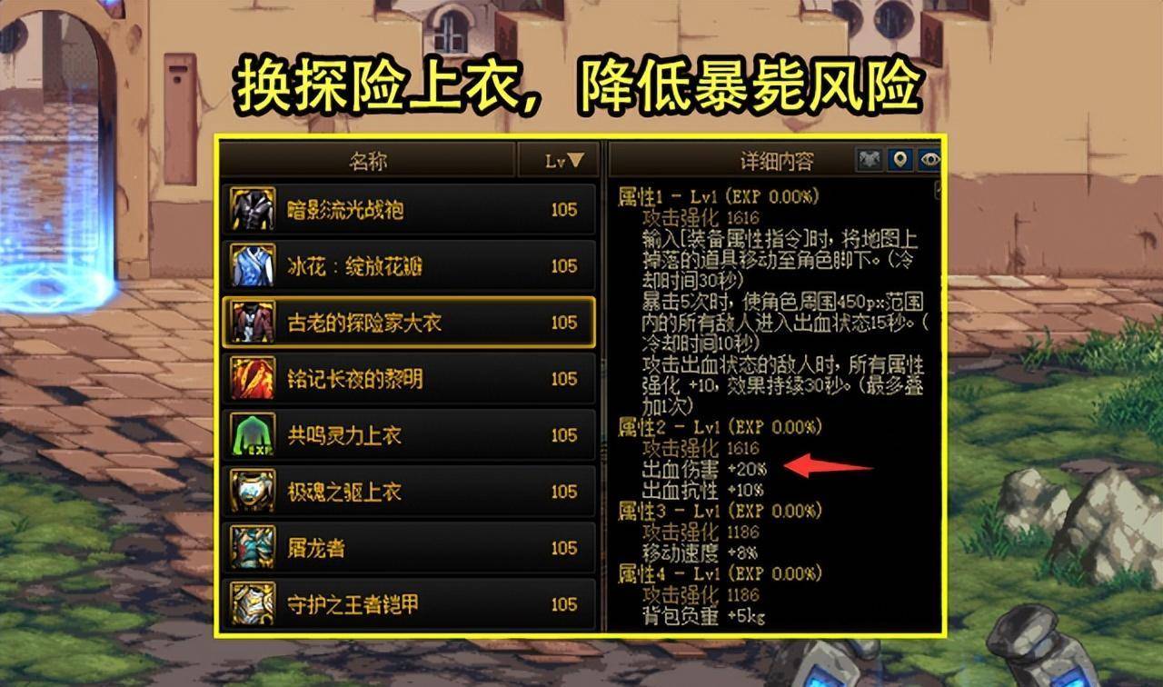 如果觉得换空血流麻烦,那么换古老的探险家上衣也是不错的选择,古老的探险家上衣也是出血上衣,比蓝灵30%出血少了10%出血,但是能大大提高玩家的生存能力,打团的时候可以换上。