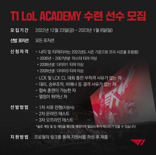 当前,T1的青训队俨然成为了“电竞黄埔军校”,全球各大赛区都不乏T1培养的选手。不仅如此,T1战队的优异成绩和规范化管理,对外界也有着很强的吸引力。随着选手年龄的放宽,如今T1青训队已经开始招募09年的玩家了。