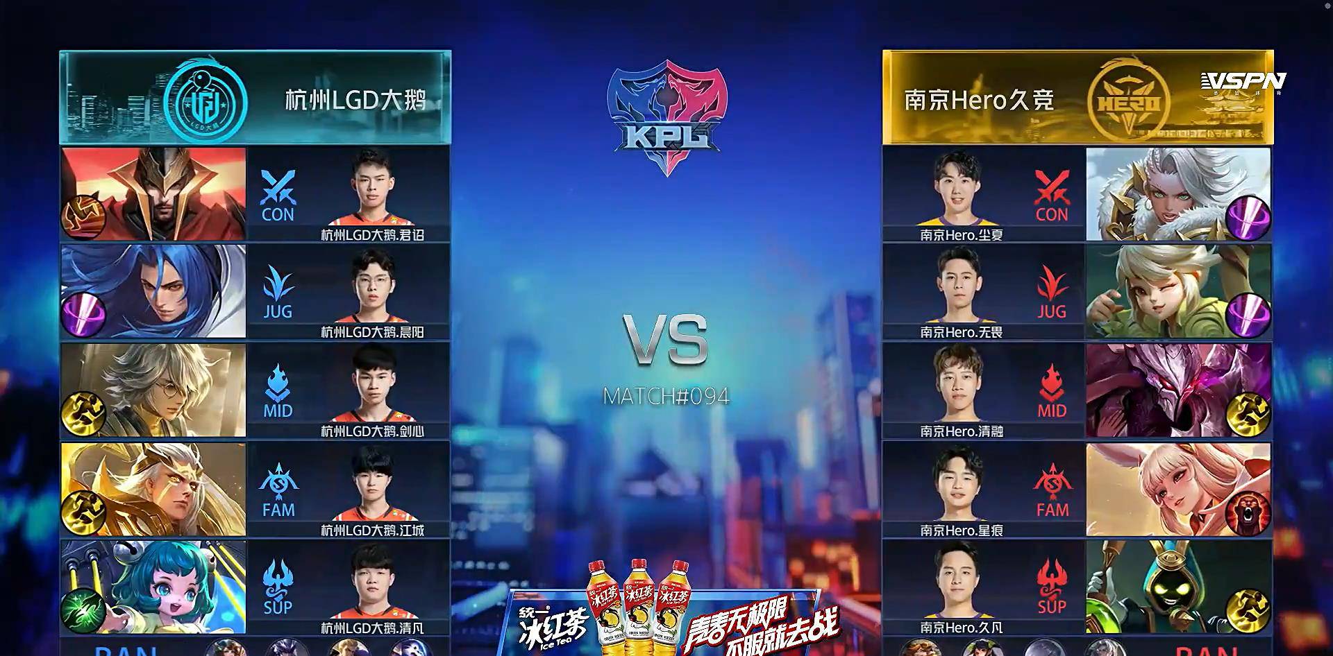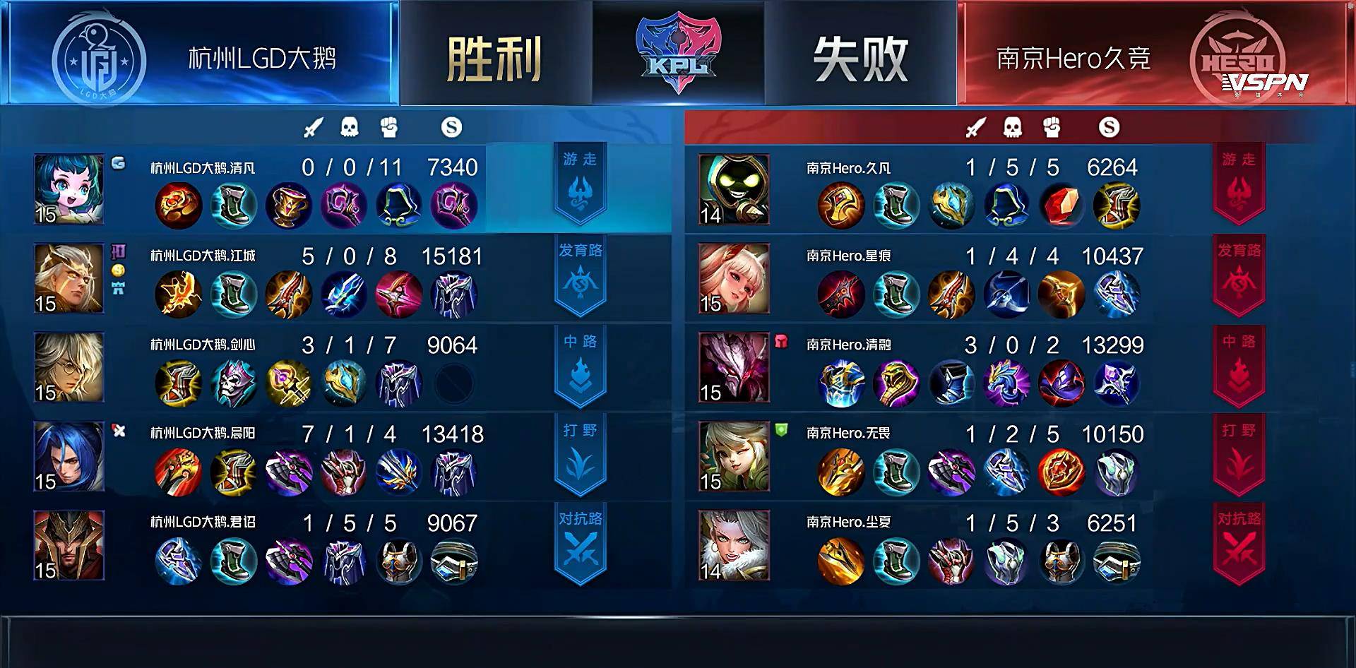 KPL春季赛常规赛第八周进入最后一个比赛日,首场比赛是杭州LGD大鹅对阵到南京Hero久竞。这两支队伍上个赛季可谓一个天上一个地下,本赛季的表现则刚好相反,LGD大鹅再也没有了上赛季的统治力。Hero久竞则是强势崛起,久哲的回归加上无畏的回归让他们一跃成为T1级别的强队。不过这场比赛Hero和LGD大鹅打满了五局,2-3不敌对手,野王无畏的表现也有点挣扎。