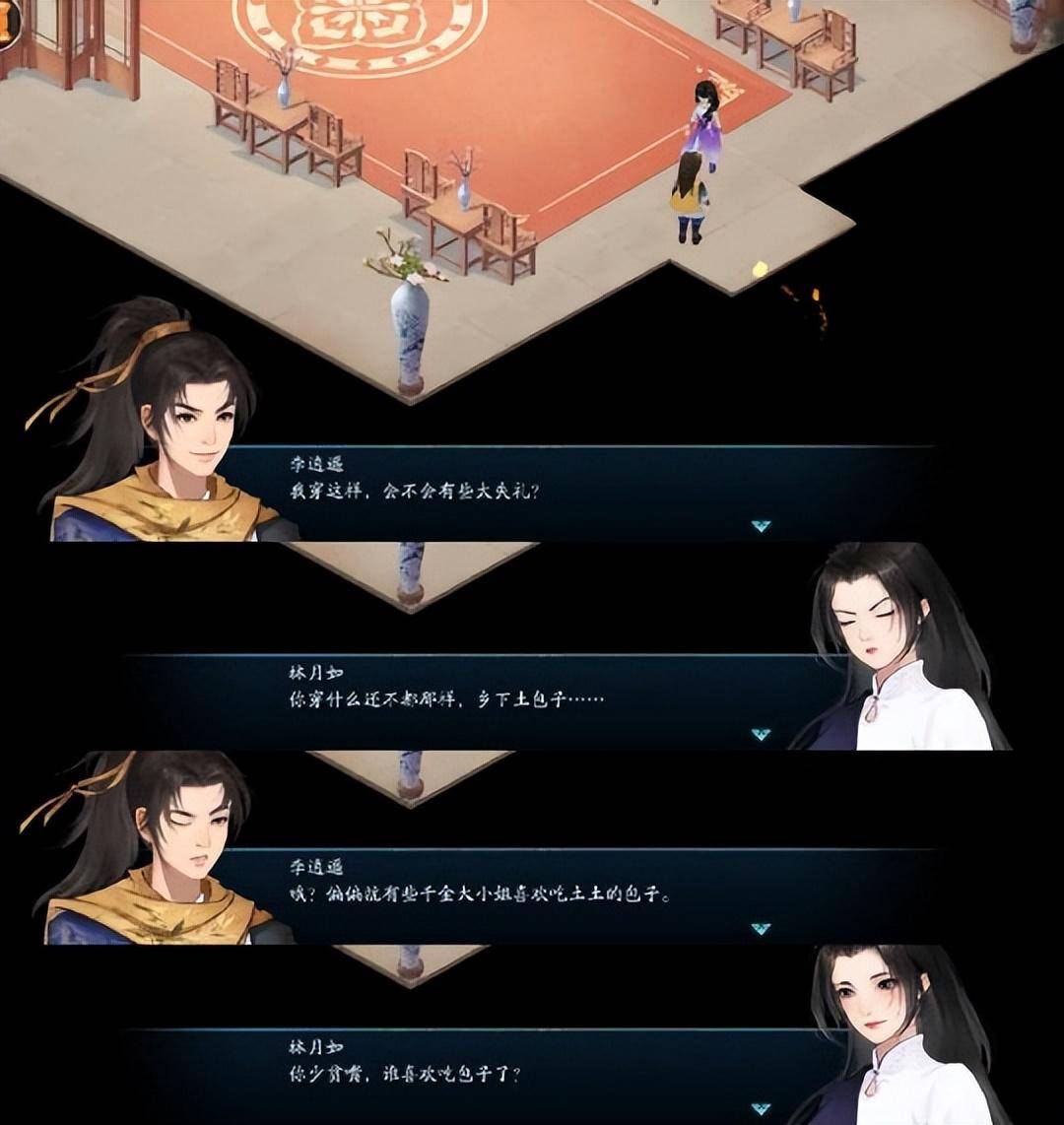 不过制作组极大的丰富了立绘的表情。就拿初见林月如之后进入尚书府这段剧情来说,对比旧版单一的表情动作,新版对二人的表情做了更多丰富的调整,月如哪怕是吐槽也显得更加娇气可爱,李逍遥的鬼脸也多了几分灵动的帅气。再加上全程配音,游玩体验绝对要好于原版。