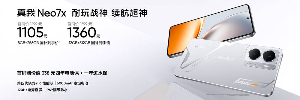 真我Neo7 SE 以及真我Neo7x购机福利加码,首销用户可获赠价值338元的4年电池保+1年进水保,更有6期免息、以旧换新专项补贴、学生限量赠耳机、晒单赢红包等福利。