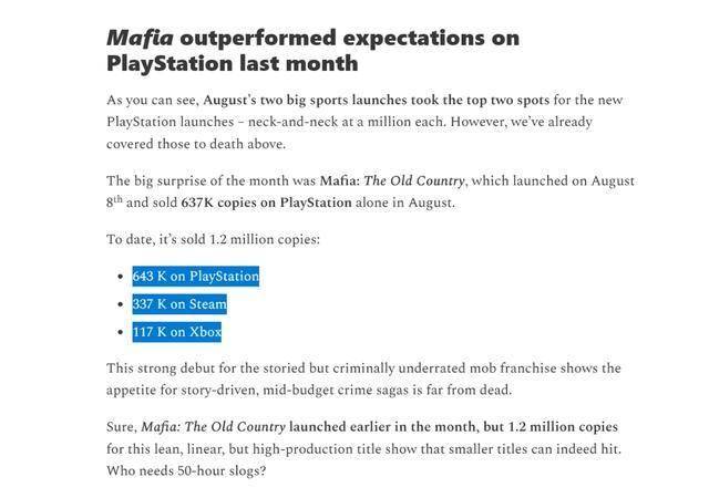巧合的是,8月份新作《四海兄弟:故乡》也是这样的情况。在120万套销量中,PS5平台贡献了64.3万套,占比53.5%,Xbox版销量只有11.7万,占比9.7%。