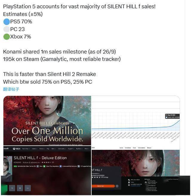 根据第三方公司统计,《寂静岭f》销售大头都在索尼PS5平台,达到了恐怖的7成,而Xbox平台只有可怜的7%,还不到一成。