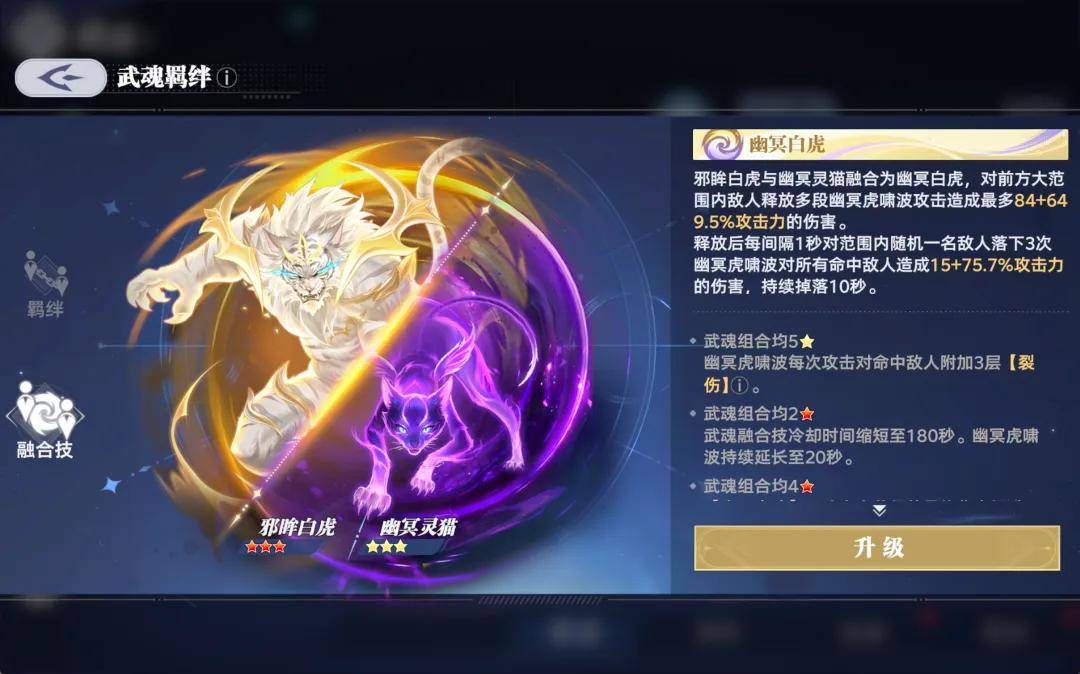 其中例如大家使用最多的戴沐白/朱竹清的武魂融合技,基础状态下依然是变身输出+持续增伤的能力,这点和原本的基础效果也是一致的,而当戴沐白和朱竹清都提升到黄色5星后其便可以新增武魂融合技攻击时对敌人额外附加“裂伤”的效果,不过说实话这个效果聊胜于无,经过实测伤害变化几乎没有......