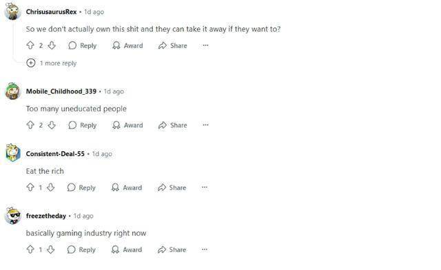 一位网友评论称:“如果玩家早知道我们买的只是许可,也许就不会那么轻易接受实体版游戏的消亡。” 许多留言对这种现实与行业现状表示愤怒,认为这正反映出数字时代游戏所有权的危机。