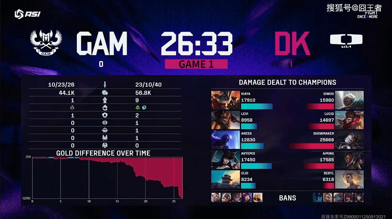 结果第一局比赛,双方差距明显,DK打成了单方面的碾压局。3分钟左右,双方同时三包一越塔上单,但Siwoo狼母换掉Elio布隆;8分钟左右,Lucid猴子抓住机会单杀Levi皇子,DK上半区碰撞完成1换2;16分钟左右,Levi脱节率先被集火秒杀,ShowMaker兜住残局拿下三杀;23分钟左右,DK团战碾压顺势拆掉中路高地;最终26分33秒,DK团灭GAM,先赢一局!