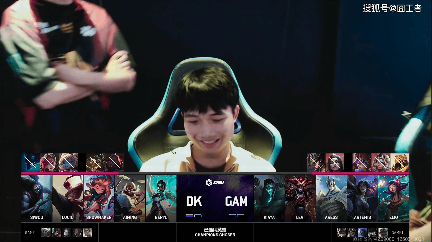 第一局比赛,GAM蓝色方,禁用:沙皇;妮蔻;阿萝拉;飞机;洛,选用:Kiaya兰博;Levi皇子;Aress瑞兹;Artemis女警;Elio布隆;DK红色方,禁用:梦魇;奇亚娜;波比;霞;烬,选用:Siwoo狼母;Lucid猴子;ShowMaker发条;Aiming卢锡安;BeryL芮尔
