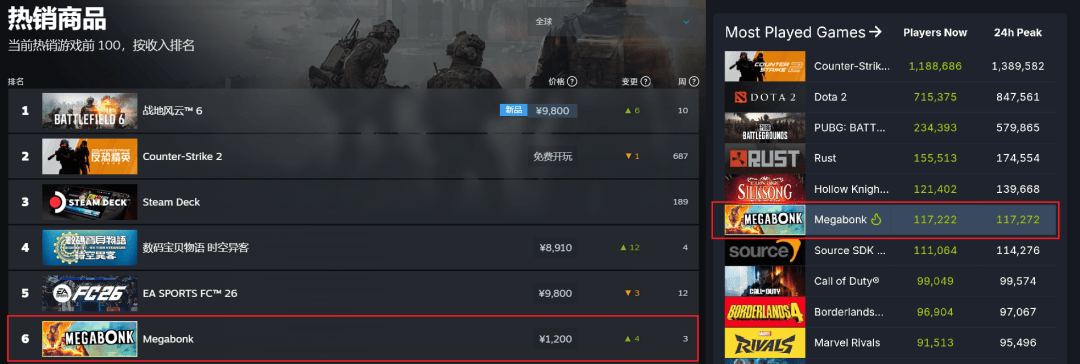 经过两周的发酵,《Megabonk》这款让人上头的游戏开始逐渐显露锋芒,进入10月后的短短几天,它连续拿下Steam全球热销Top 6、热玩Top 6、同时在线11.7万,以及Twitch12.9万观看人数的成绩。