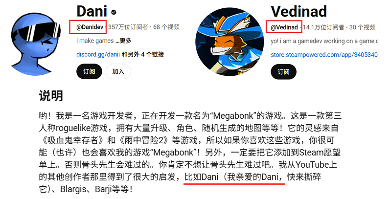 游戏发售没多久,就有欧美玩家怀疑《Megabonk》的作者vedinad是几年前销声匿迹的知名博主Dani,因为前者的YouTube账号名就是后者账号名的倒序写法。而且vedinad还在自己的简介里,跟Dani来了波高强度互动。