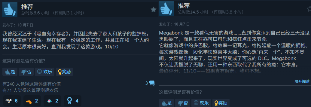 这时候的《Megabonk》在欧美独游圈、游戏直播圈已经掀起了一阵潮流,大量乐子人开始入侵评论区,一边高呼过瘾,一边打分11/10,让游戏即便顶着不分区域的差评,也依靠2万5千多条好评,拿到了94%的好评率。