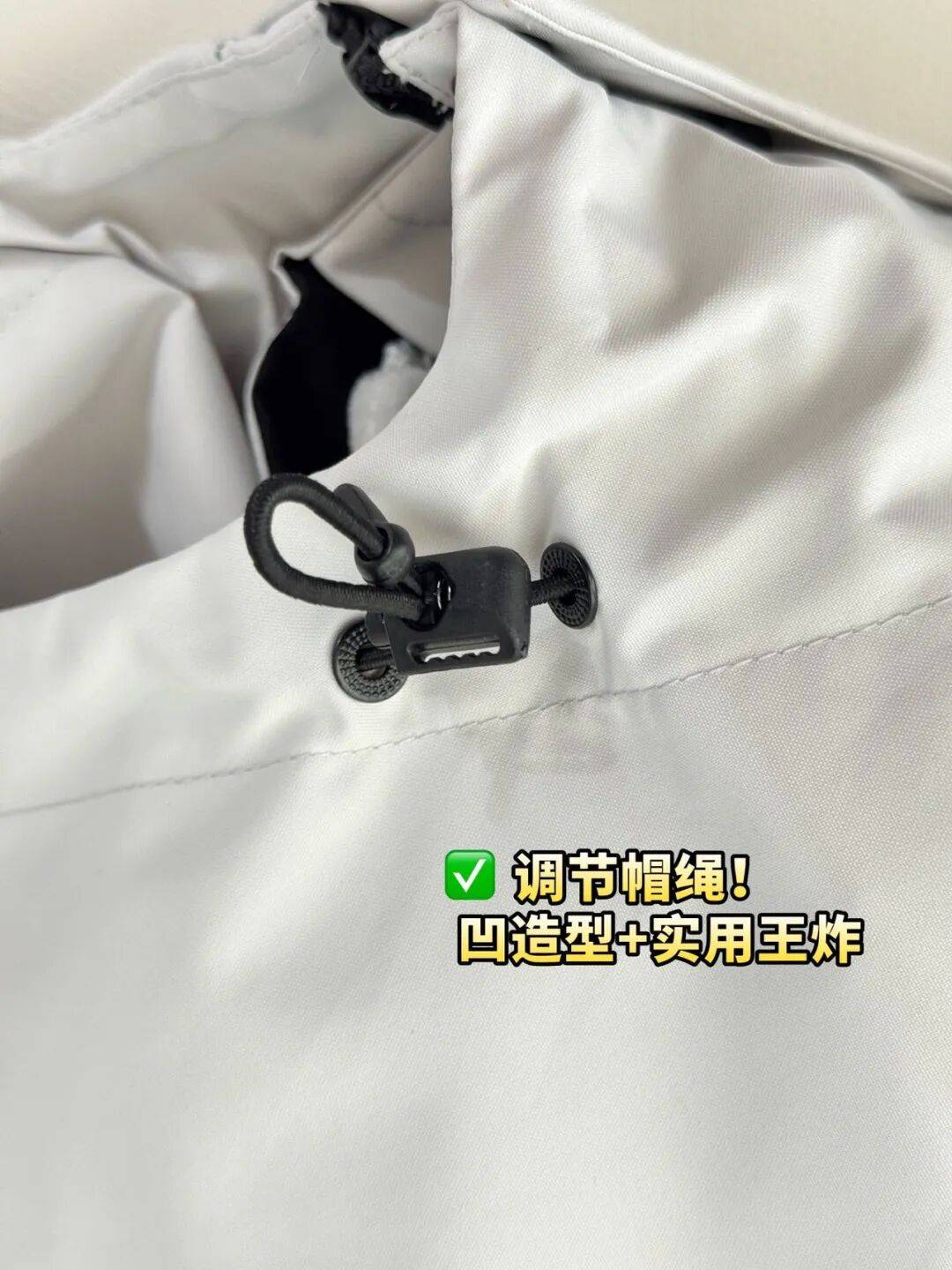 调节帽绳!凹造型+实用王炸徒步遇狂风、城市碰细雨轻轻一拉,帽子秒贴头部!风灌不进雨渗不到脖子,稳稳守护。