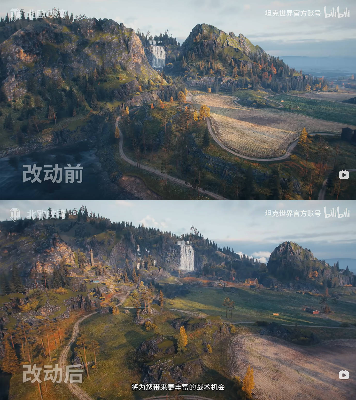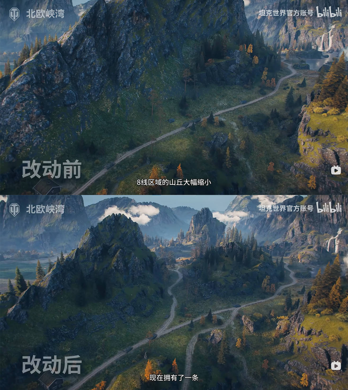 特别是北欧峡湾,这张被车长们吐槽多年的地图是终于迎来了大范围调整。最显眼的就是右侧的大山倍被WG以“劈山救母”的精神进行了大改,它的整体高度被降低,中间还硬生生砍出了一条进攻通道。这样一来,下方出生的车长就不必累死累活的开车跑到A0才能进攻了。