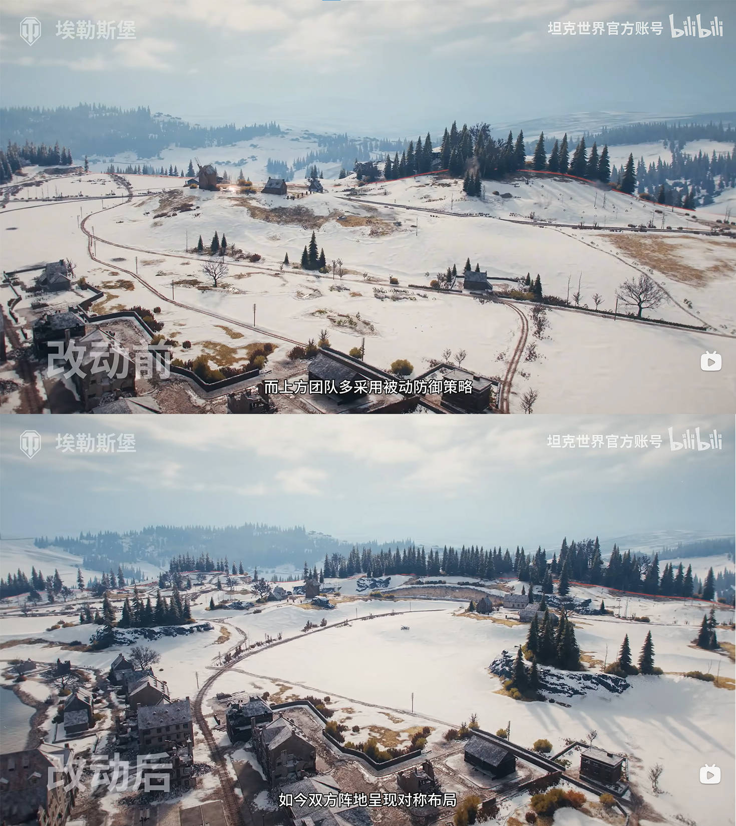 这种平衡调整也出现在了埃勒斯堡的90线上,这里也是一个车长们吐槽很久的点。在旧地图中,下方队伍凭借地形优势能够在前期形成对上方队伍外线兵力的压制,同时能从容偷袭城内的上方队伍巷战兵力。
