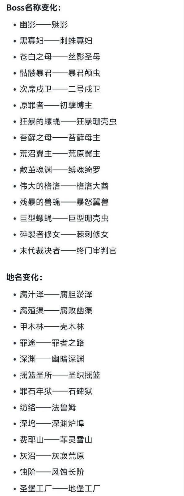 本次更新的中文补丁将大部分地点与Boss名称进行修改,但许多在玩家社群中得到认可的地点与Boss名称也被修改,让大多玩家无法接受,甚至有些翻译出现了不堪的谐音,例如“苔藓母主”等,第一章的“纺络”也被改成了“法鲁姆”。本次翻译也被称为从另一个“古蜂小生”变成了另一个“古蜂小生”。
