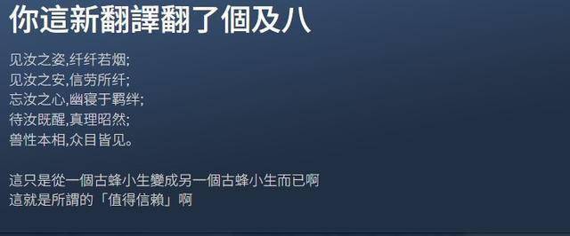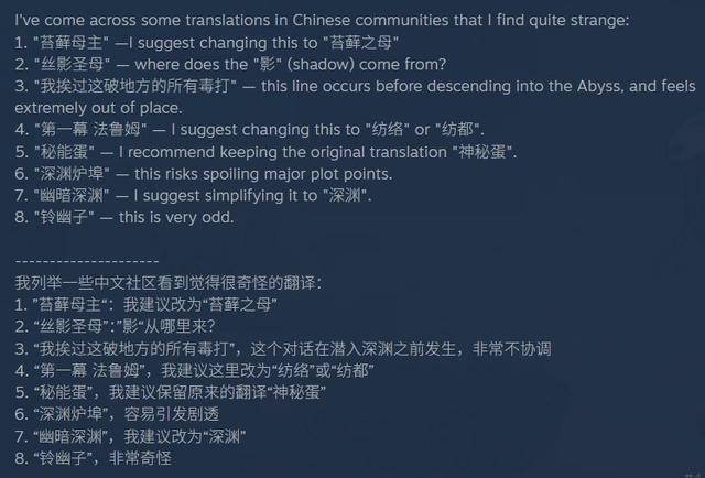 《空洞骑士:丝之歌》发售版本的翻译因其白不白、文不文的翻译风格与添油加醋毁原文的翻译态度被玩家社区诟病,尤其在剧情解析与猎人图鉴方面极为严重。而本次4号补丁的翻译据社区玩家们的反馈,似乎更加不堪。