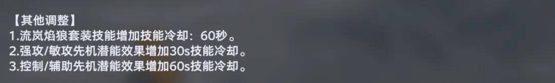 最后便是焰狼魂核的cd调整,新增一个60秒的cd更多是为了同步匹配控制、防辅角色的先机潜能,大家注意这里写的是先机潜能而并非是先机技能,所以跟部分朋友之前的理解可能会有些偏差,反正目前焰狼+先机触发的这个组合就是60秒的操作cd,不像之前可以通过部分特殊办法或特殊角色去取巧了......