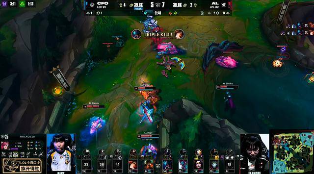 前期两队打的十分小心,并没有爆发激烈的对抗,AL率先拿到一血,并连续控下两条小龙。CFO在15分钟抓死Shanks瑞兹,成功控下峡谷先锋。CFO利用先锋推掉AL的中一塔,随后双方在河道爆发团战,Junjia猴子的分身骗出AL三个大招,CFO团战大获全胜顺带控下小龙。