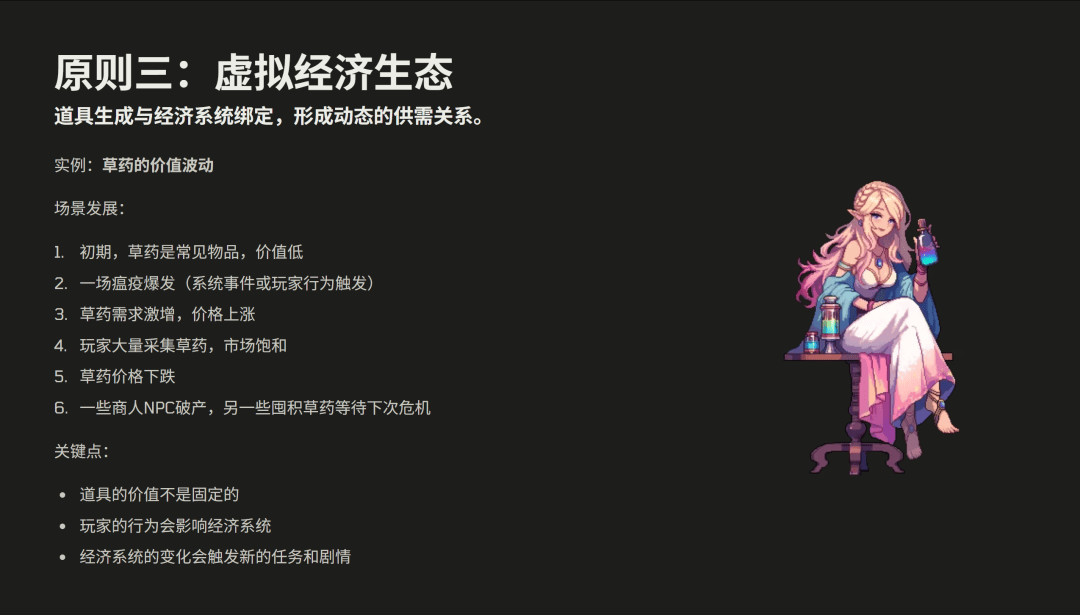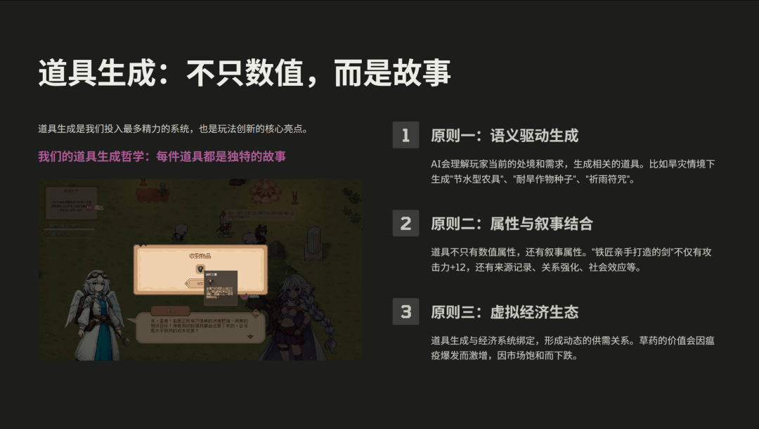 我们有三个原则。第一个是语义驱动生成,第二个是属性要跟叙事相关,第三个是它要产生一个虚拟的经济生态。