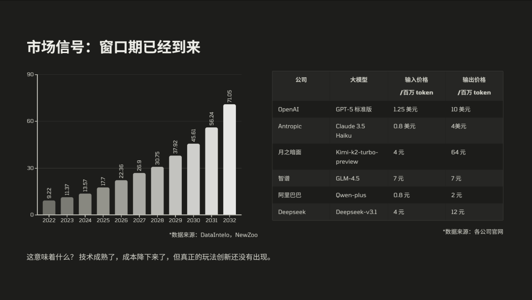 全球的 AI 游戏市场,预计从 2023 年到 2032 年,复合增长率将达到 23.3%,而同时大模型的 Token 价格在过去的两年内下降了 90% 以上,但是目前大多数游戏厂商它其实还停留在 AI NPC 的聊天的阶段,这意味着什么?