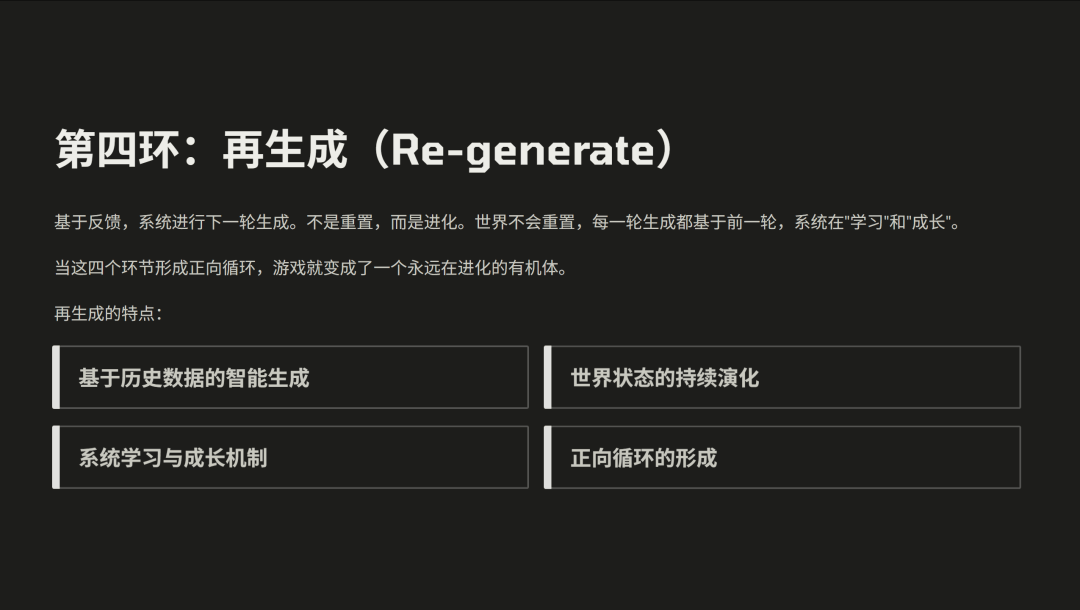 第三,“记忆和成长”。只要系统有记忆,世界就能成长;如果没有记忆,那所有内容都只是随机指令,不是真正的生成。