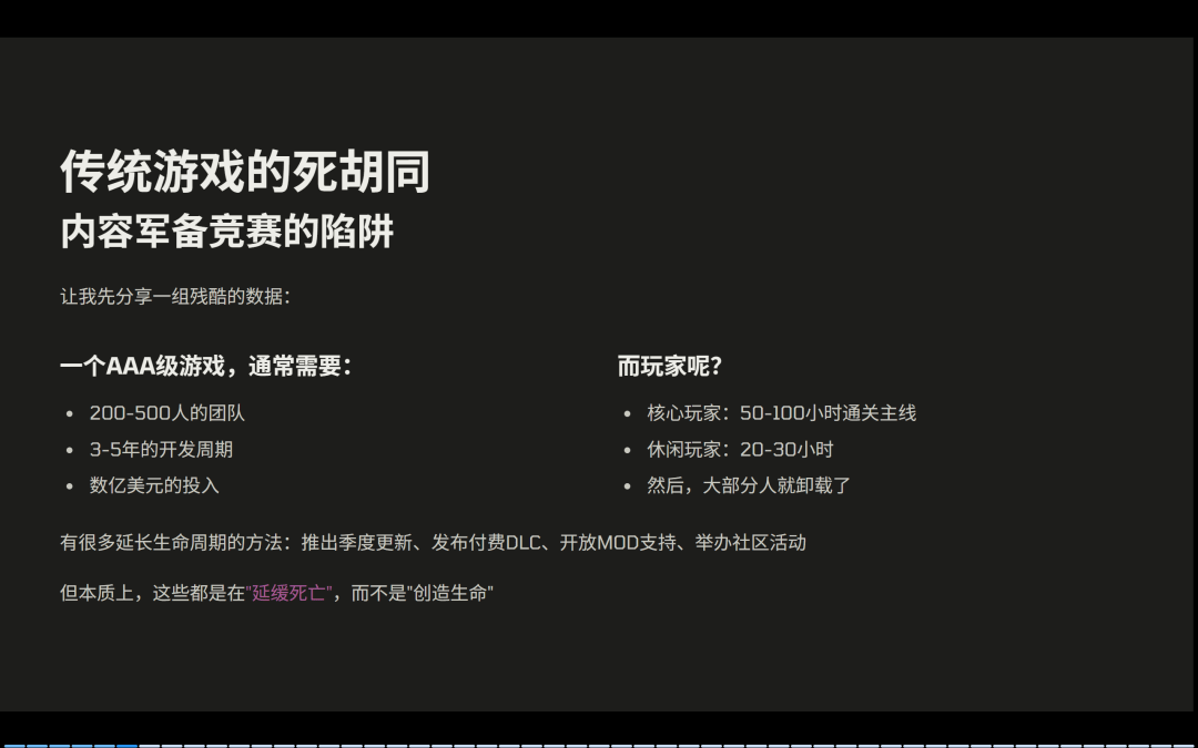 我认为这时候游戏也面临三大不可持续的危机:第一个危机是经济的危机,3A 成本太高,高达两三亿美元,周期很长,可能是 5~7 年开发时间。