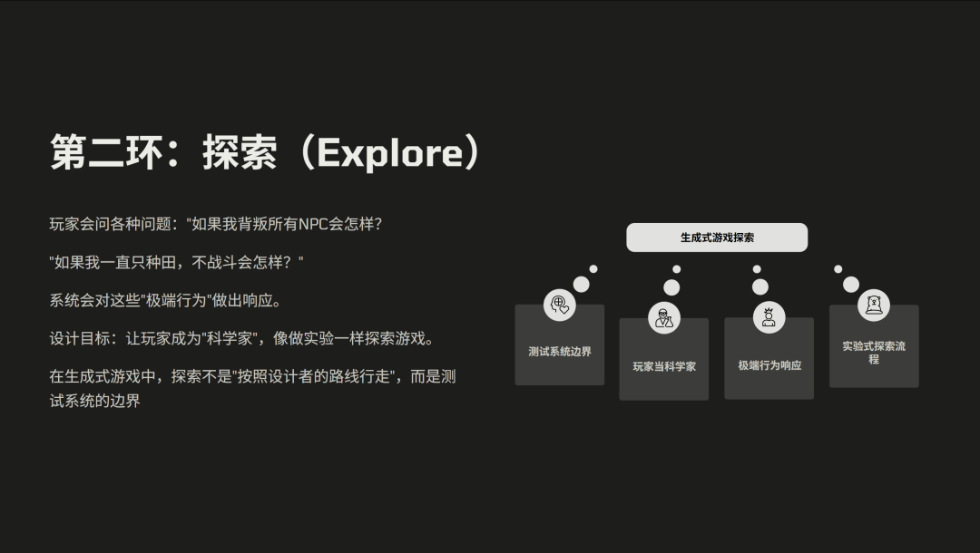 第二,涌现性。我们不去假设所有可能的玩法,而是设计规则,让 AI 和玩家在对抗中自然涌现新的内容。
