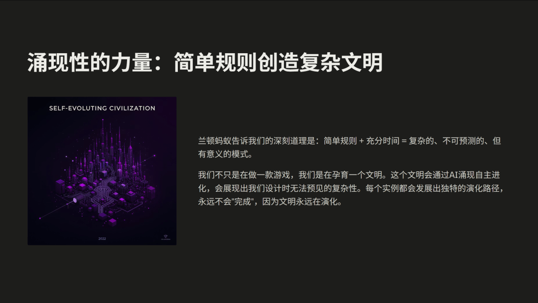 同样地,我们或许不是在做 AI 游戏,而是在孕育一个新的文明。这个文明会在规则中生长出我们预料之外的复杂性,它永远不会“完成”,因为它永远在生长。