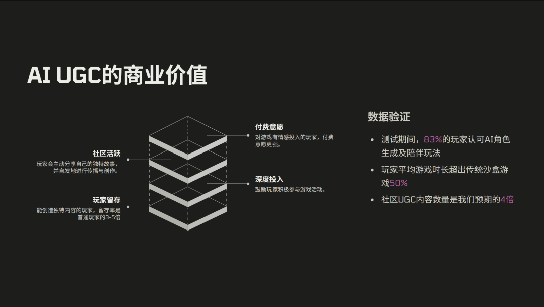 从数据的验证来看,我们有 83% 的玩家认可 AI 陪伴的一些玩法,玩家平均游玩时长超过传统的沙盒游戏 50%,社区 UGC 内容是我们当时预期的 4 倍左右。