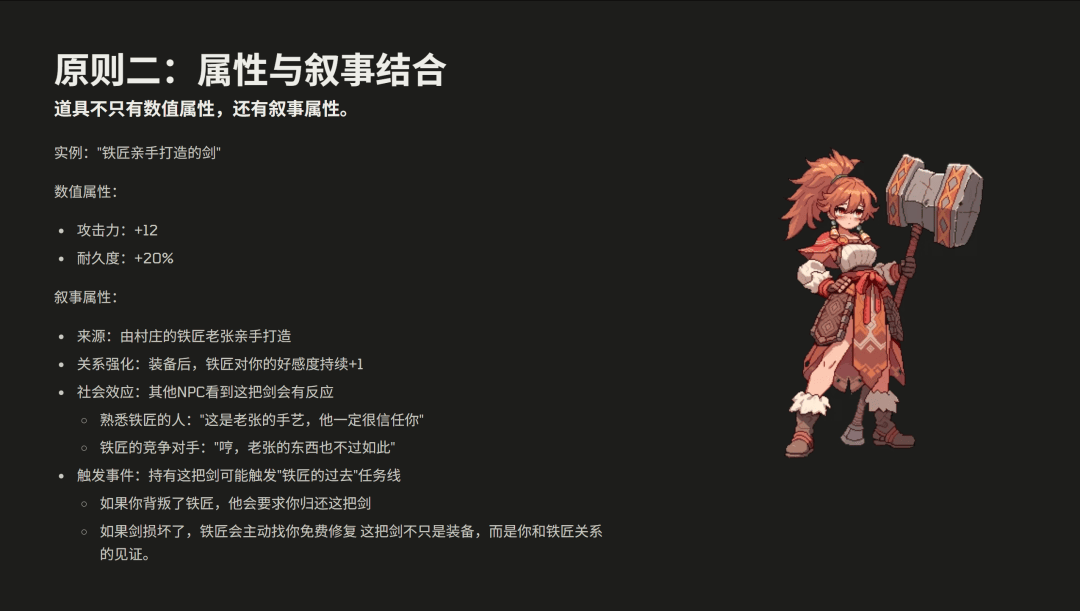 第二个原则,就是我们的属性要跟叙事结合。比如说那把铁匠亲手打造的剑,数值属性可能是攻击力 +12,耐久度 +20%。而它的叙事属性则是由村庄的铁匠亲手打造,在装备之后,铁匠的好感度会上升。
