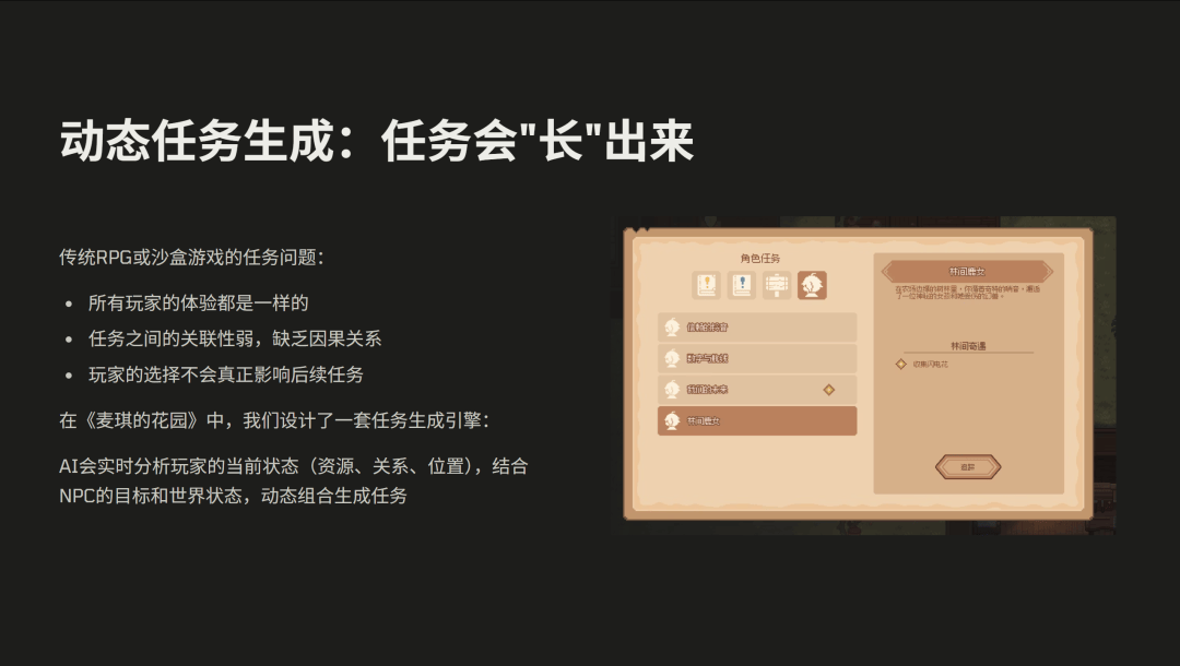 但我们认为,生成式的任务是不一样的。在我们的游戏当中,我们设计了一套任务生成的系统,AI 会实时分析玩家的状态,包括他的资源,他的社会关系,还有他的位置,结合他的目标和世界的当前的状态,动态地生成任务。