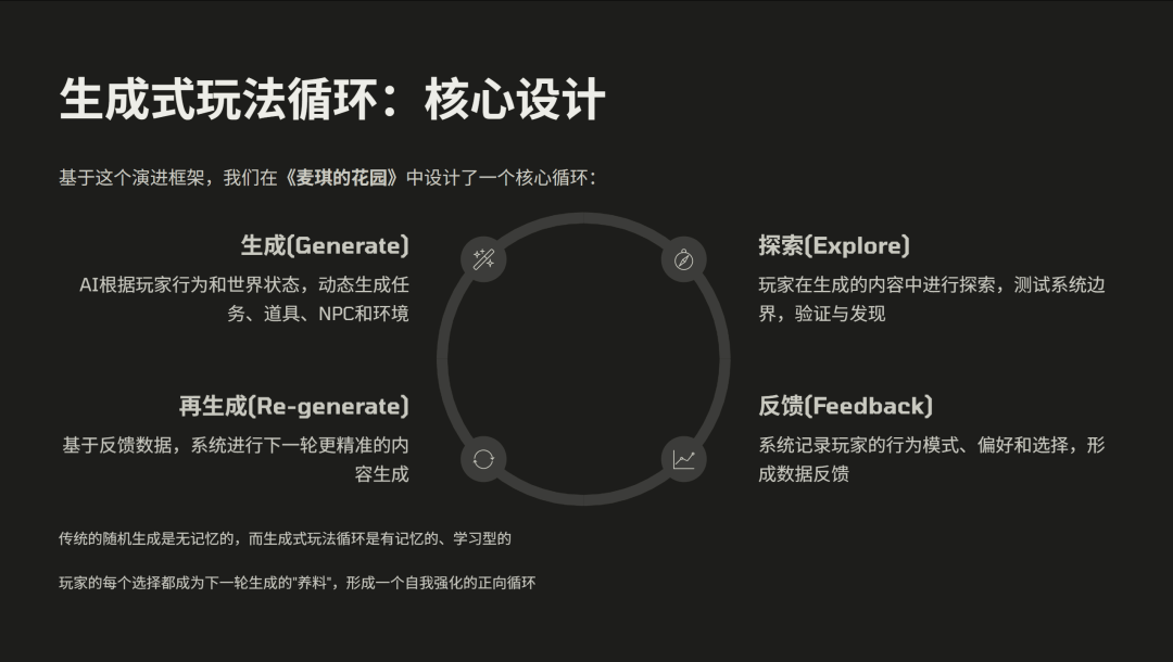基于这样的一个框架,我们做了一款产品叫《麦琪的花园》。我们所设计的一个核心循环,是“生成 → 探索 → 反馈 → 再生成”。