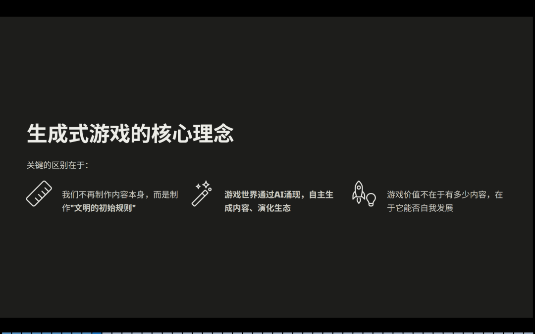 而我们理解的生成式游戏的一个逻辑,是开发者只负责去定义规则,经由AI涌现的系统,最终游戏会发展出自我进化的能力。
